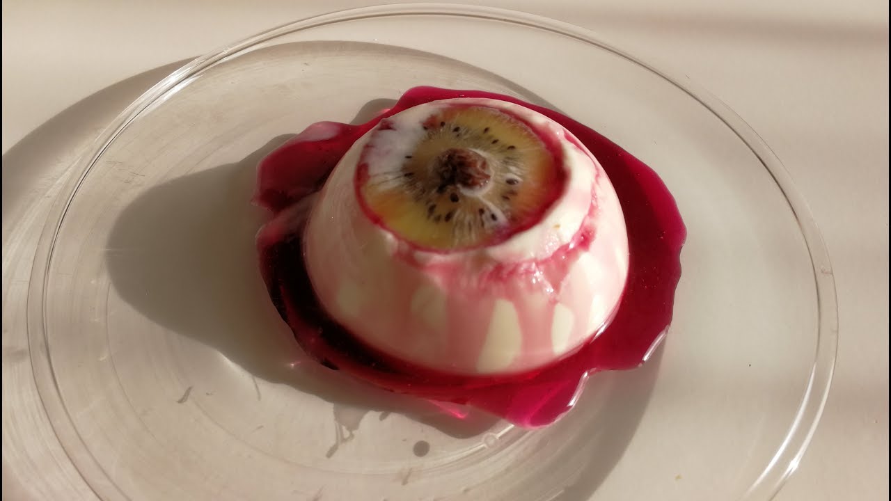 - Decoramos los "ojos" con la salsa de frambuesa, como si fuera sangre y servimos.